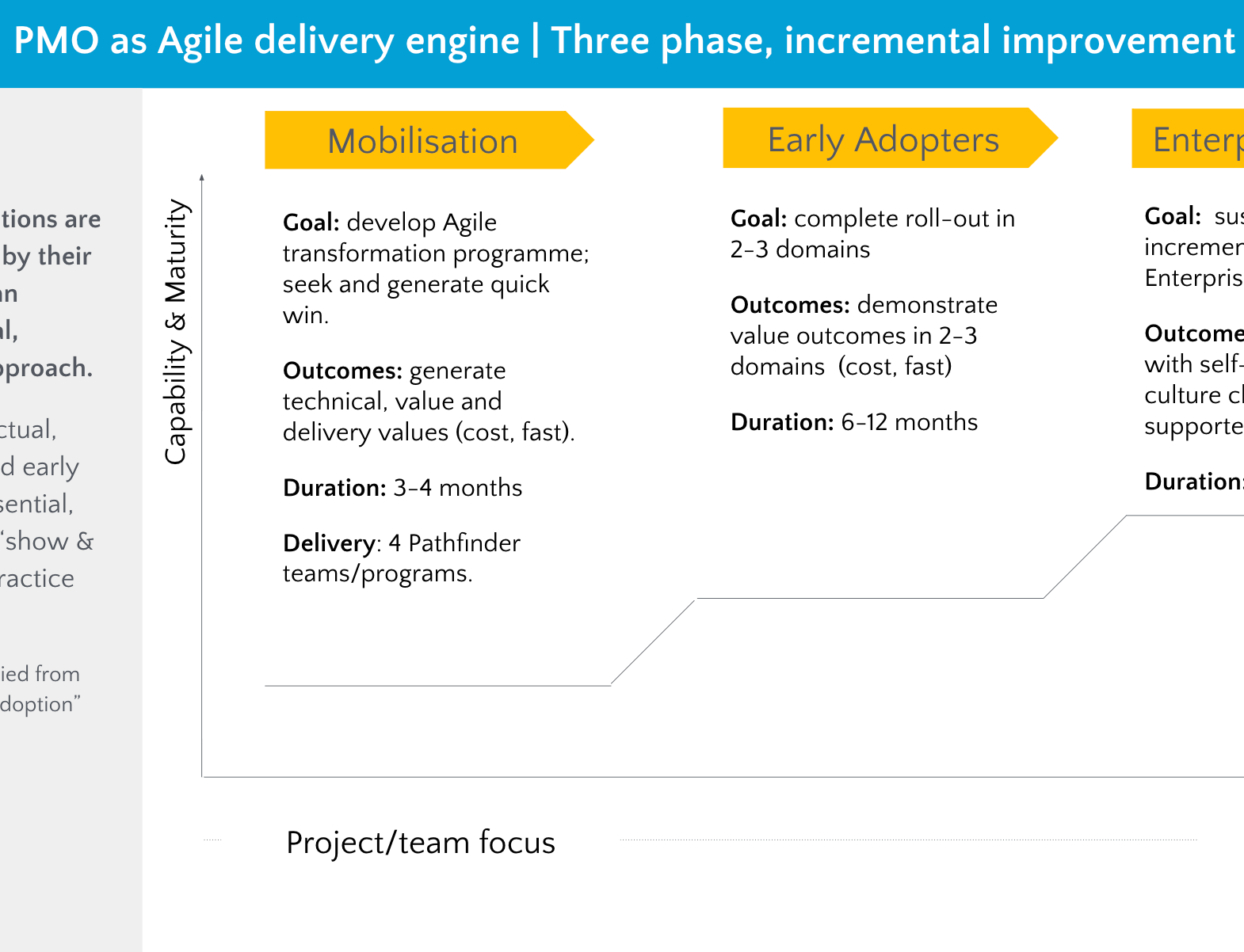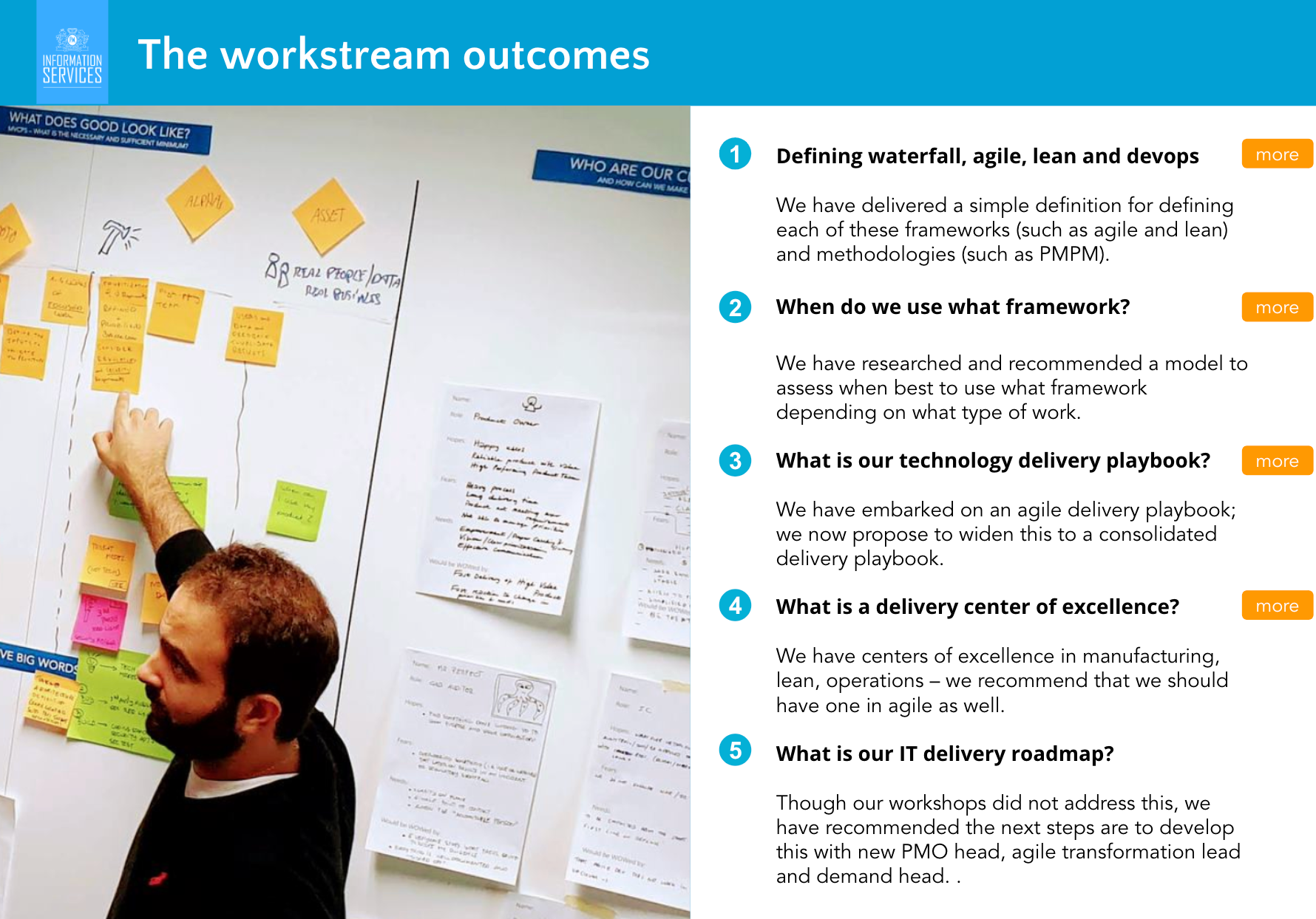 Lots of work integrating "waterfall" people, projects and processes into new Agile delivery models, on the way working closely with the likes of Bain, McKinsey and BCG on enterprise transformations.